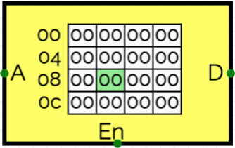 The ROM circuit element includes three pins. As Figure 4.10 elucidates, it accepts a 4-bit address input (A) and the corresponding value stored in the particular address is returned as a 8-bit output (D) (initial address always starts from 0). The Enable (En) pin enables the ROM.