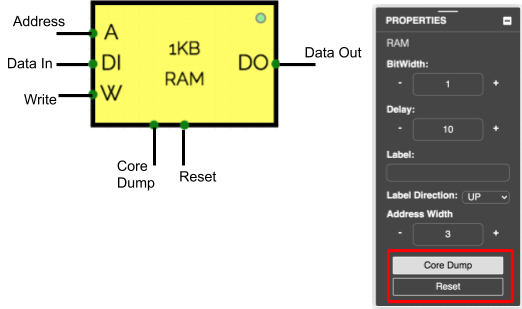 Alternatively, the contents of the RAM can be dumped to the console by transitioning the Core Dump pin to 1 or clicking the Core Dump button in the PROPERTIES panel. Any address spaces that have not been written will show up as undefined in the core dump.